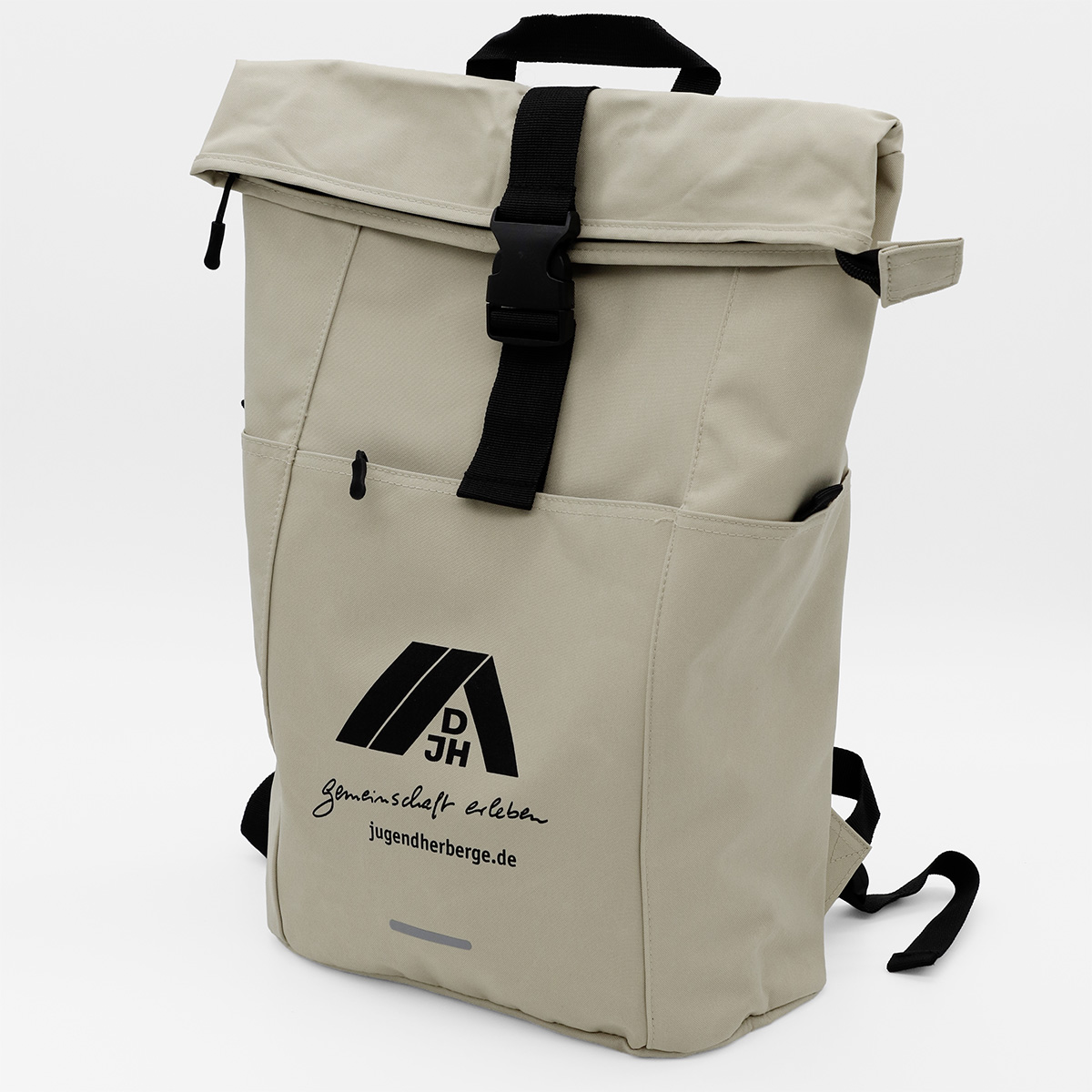 Roll-Top-Rucksack von HALFAR, beige, Logo vorne in schwarz, passend zu den schwarzen Schnallen, Maße ca. B29 x H44 x T14 cm, Oberstoff aus recycelten Fasern, großes Hauptfach mit Reißverschluss und zusätzlichem Steckverschluss, großes gepolstertes Einsteckfach, Air-Tag-Einsteckfach, zwei seitliche Einsteckfächer außen, gepolstertes Tragesystem